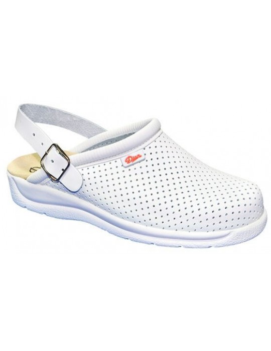 Sabot à courroie repliable retenue au talon, fait de cuir de vache avec rembourrage perforé sur le cou pour éviter les frottements, monté sur outil droite à bout arrondi. Maintient du talon par une bride ajustable. Forme droite à pointe arrondie. Semelle anatomique, suivant la forme métartasienne du pied, doublée cuir. Semelle en polyuréthane, antidérapante double densitée, Bi-composant polyuréthane et TPU pour augmenter le coeficient d’adhérence du sabot.