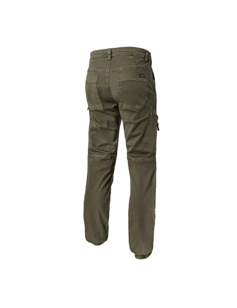 Ceinture semi élastiquée avec cordon de serrage taille, 5 passants, braguette zippée, 2 poches italiennes, 2 grandes poches cuisses zippées dont surpoche smartphone à droite fermée par velcro, 2 poches plaquées au dos, renforts genoux doublé en tissu ripstop avec pinces, bas de jambe resserré par élastique.